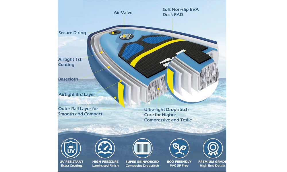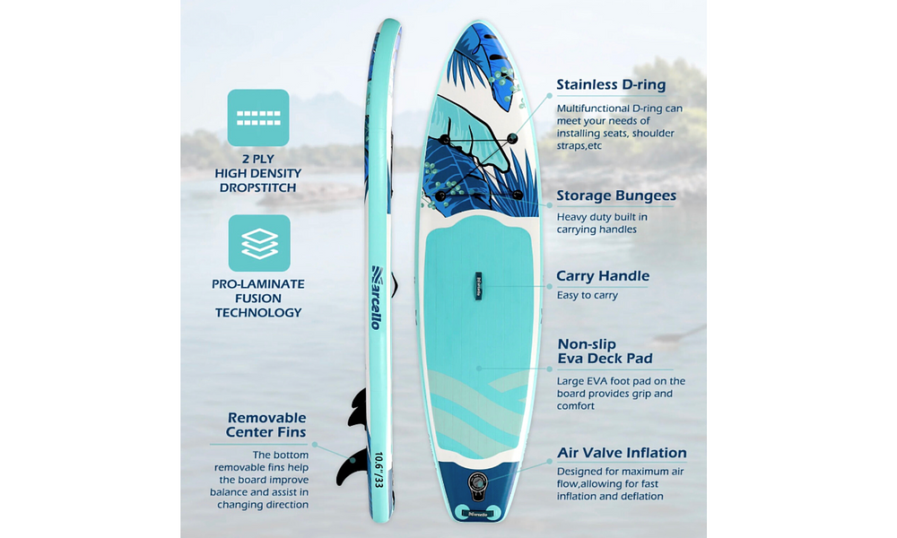 Glide across the water with ease on this versatile 10'6 inflatable stand up paddle board, designed to make your paddling adventures smooth and exciting! Whether you're exploring calm waters, catching small waves at the beach, or just having a chilled day out, this board is your perfect companion. With a sleek design and a lightweight build, it's easy to transport and quick to inflate, so you can spend less time prepping and more time paddling. Grab your paddle, hit the water, and let the fun begin!