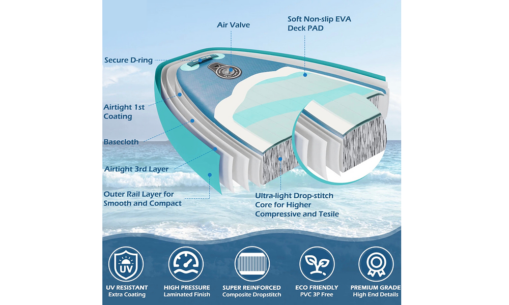 Glide across the water with ease on this versatile 10'6 inflatable stand up paddle board, designed to make your paddling adventures smooth and exciting! Whether you're exploring calm waters, catching small waves at the beach, or just having a chilled day out, this board is your perfect companion. With a sleek design and a lightweight build, it's easy to transport and quick to inflate, so you can spend less time prepping and more time paddling. Grab your paddle, hit the water, and let the fun begin!