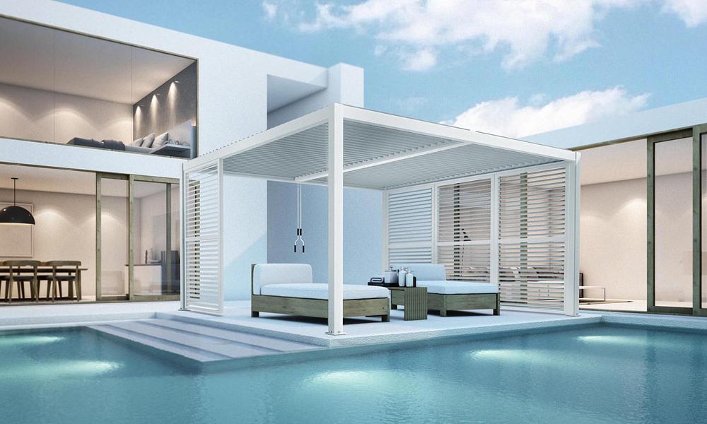 Transform your outdoor living area in an instant with our Aluminium Louvre Pergolas. The beautiful powder-coated, matte-finished aluminium, brings an architectural flair that is able to be enjoyed rain, hail, or shine, thanks to the adjustable, gear-cranked louvres. Four seasons in one day? No Worries.