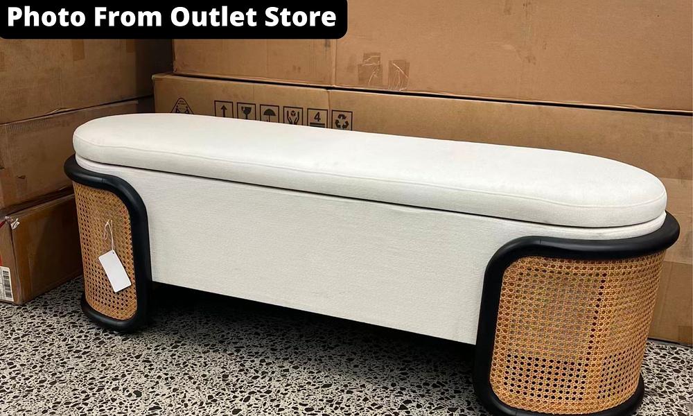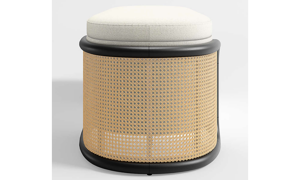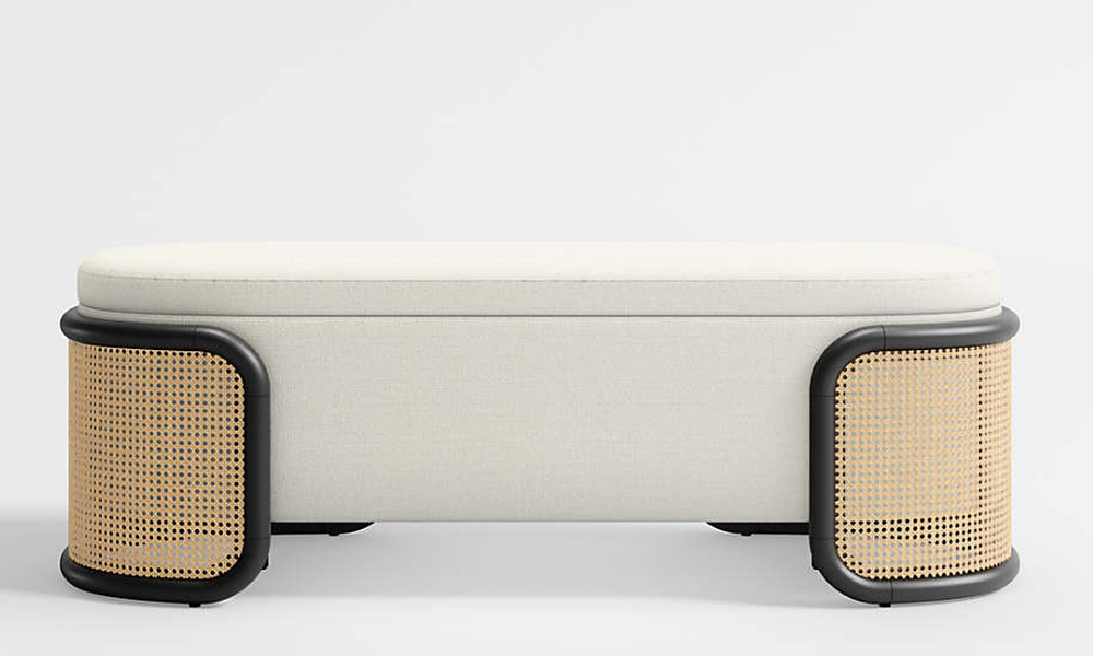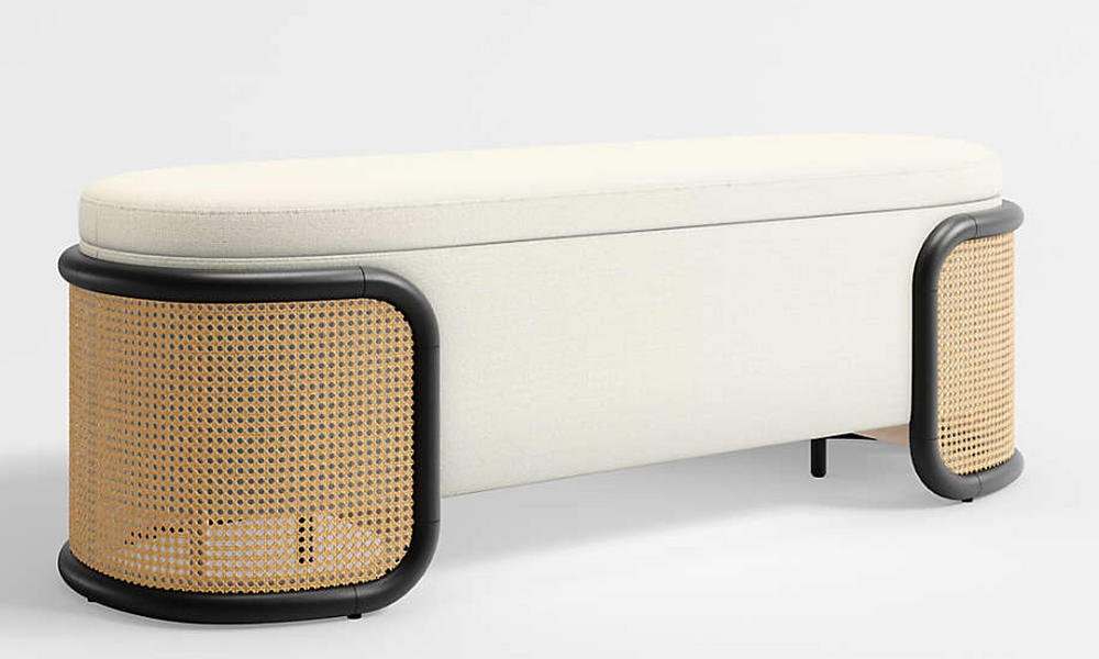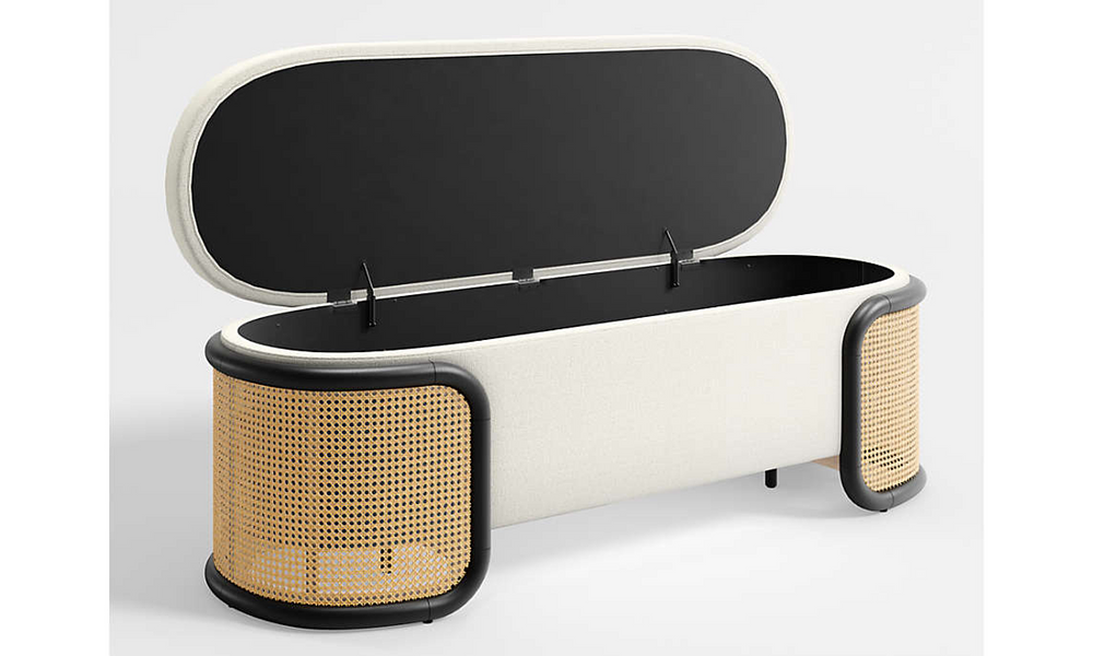 Channeling 1930s curves and mid-century caning, Anaise flirts with tradition in an eye-catching design that's totally now. Black-stained beechwood inset with woven cane sculpts the bench's curvilinear base to float an oval seat clad in a white textured fabric. The seat lifts to reveal a roomy storage area lined in black linen that's perfect for storing pillows or throws. Contemporary yet approachable, our exclusive Anaise bench is an eye-catcher in an entryway or at the foot of a bed.