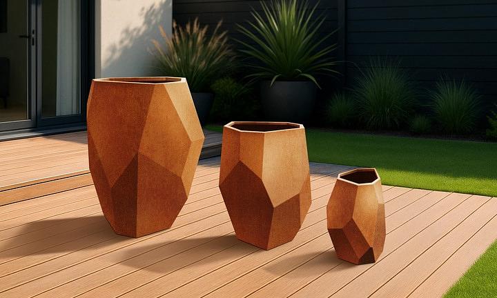 Available in three sizes, they’re made to mix, match and layer. Pop one by the doorway, scatter a few through the garden, or cluster them like a sculptural installation that just happens to grow greenery. Wherever they land, these hexagonal planters bring warmth, style, and just the right amount of edge.