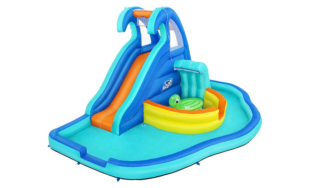 One word... Wavetastic! The Bestway Mega Water Park has all the bells and whistles necessary for a splashtastic summer! For up to 6 people the waterpark includes a built-in mini pool with a ride-on turtle toy, a refreshing waterfall and of course the wild ride slippery slide!