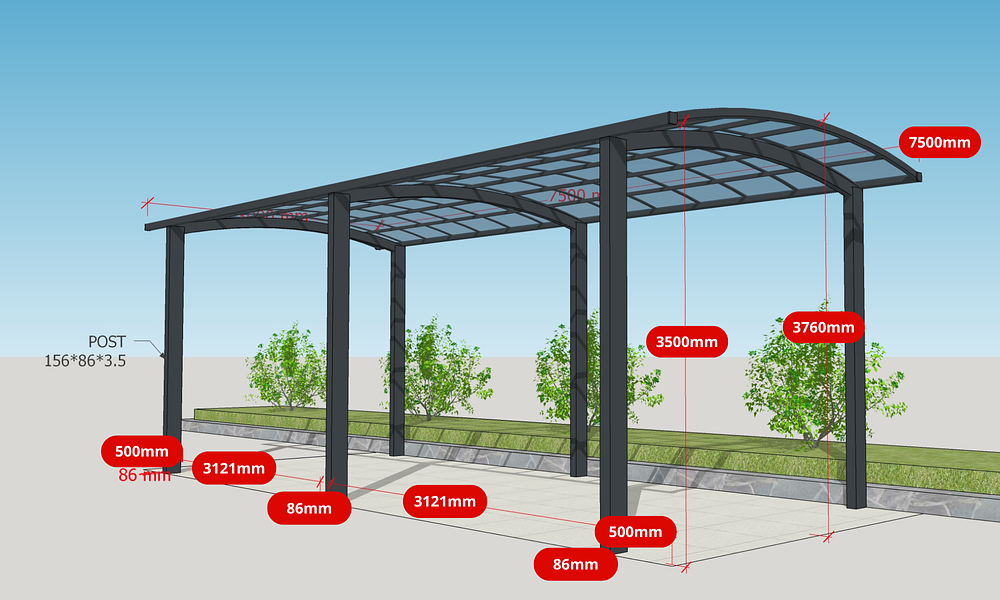 The curved roofline adds a sleek, modern finish and allows for easy water runoff, with six solid support legs (three on each side) providing reliable strength and stability. Made from powder-coated aluminium, it’s built to handle the elements, wind-ready, and stylish enough to level up any driveway or outdoor space.