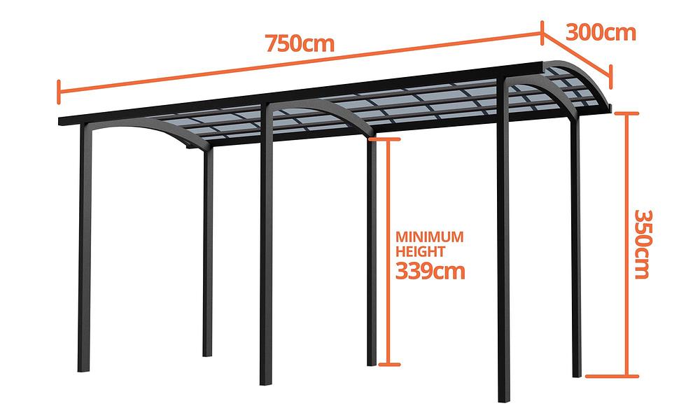 At 7.5m x 3.5m, it’s purpose-built to handle the big boys, offering serious height, generous clearance, and full-length protection. No awkward overhangs. No tight squeezes. Just sleek, weatherproof shelter from end to end.