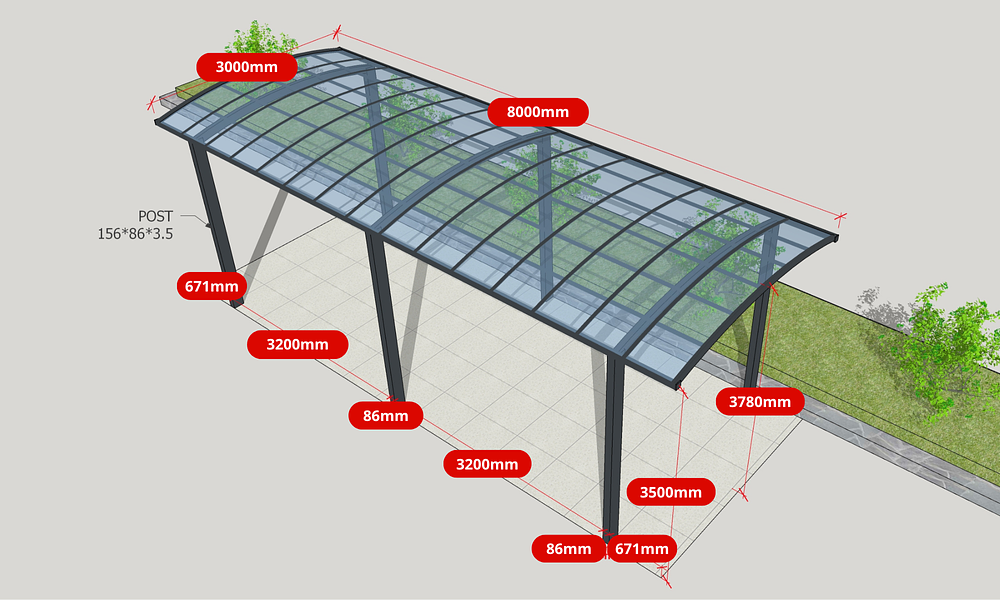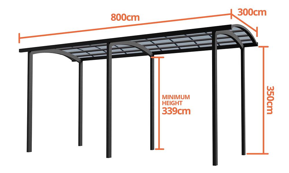 The curved roofline adds a sleek, modern finish and allows for easy water runoff, with six solid support legs (three on each side) providing reliable strength and stability. Made from powder-coated aluminium, it’s built to handle the elements, wind-ready, and stylish enough to level up any driveway or outdoor space.