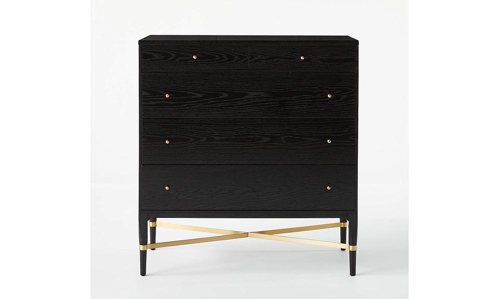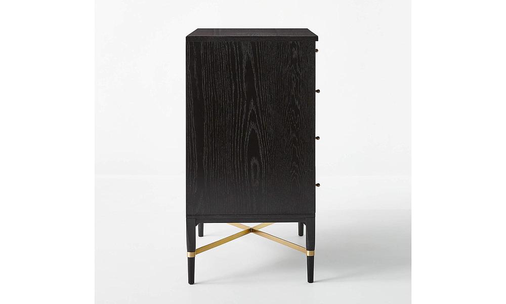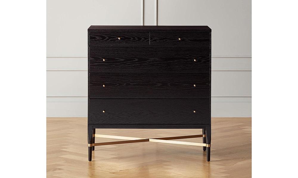 The slender lines, fine veneers and architectural detailing of Paul McCobb's Connoisseur Group are just as elegant today as they were when first introduced in 1954. Beautifully crafted wide wood dresser features ebonized oak and brass crossbar and hardware—thoughtful details and sculptural influences that are stunning in their simplicity. CB2 exclusive.