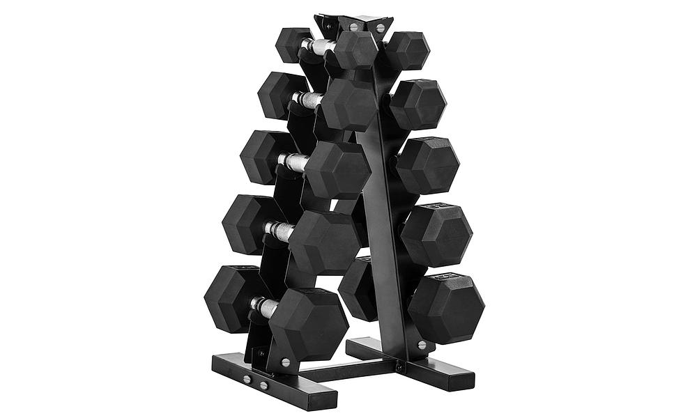 Don't wait for weights! Why queue up at the gym when this rack of beauty is sitting at home eagerly awaiting your attention. Made with heavy-duty powder-coated steel the 10 dumbbells sit 5 aside on the custom rack according to weight so they'll always be safe, secure, and exactly where you need them to when it's time for beast-mode! Pumping iron whenever the mood takes you....you may never leave the house again!