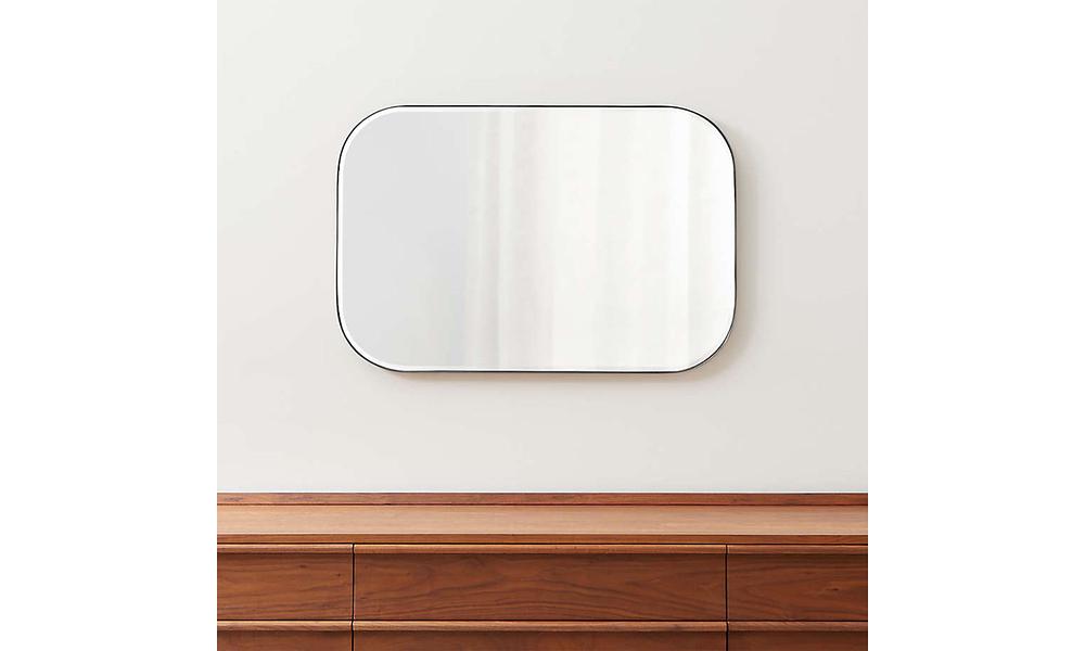 Edged with a slim brass band, this minimalist wall mirror curves a subtle arch of modern elegance. A Crate & Barrel exclusive, its reflective beveled glass creates delicate interest. With its brass-finish stainless steel frame, the arched wall mirror is an understated essential in any room and is safe to hang in bathrooms. Group with our Edge round, capsule, and rounded rectangle floor and wall mirrors in brushed nickel, brass and gunmetal to create an intriguing geometric display.