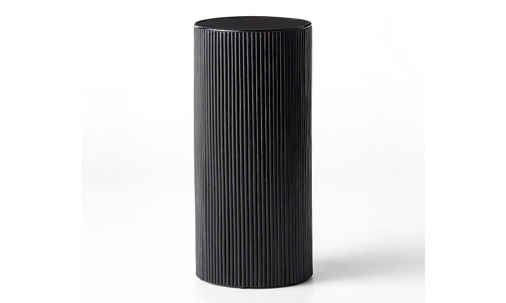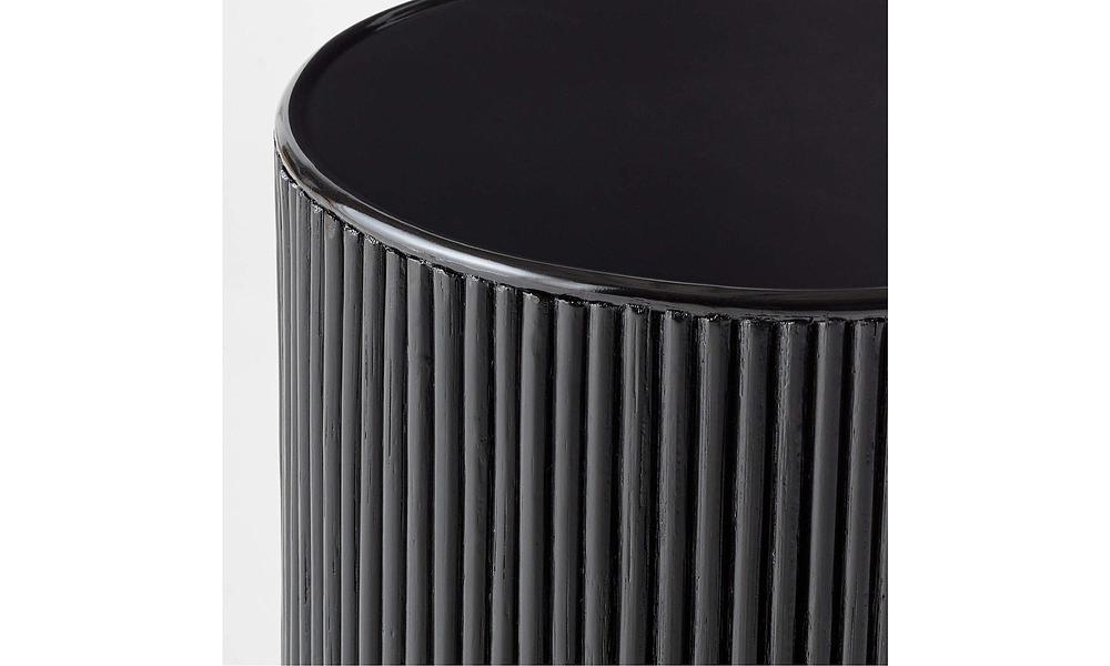 Black lacquered finish elevates Mermelada Estudio's rattan pedestal table. Topped with a smooth, glossy black wood surface, its simplicity provides the perfect contrast ensuring sculptures, vases, plants and other objects of importance stand out.