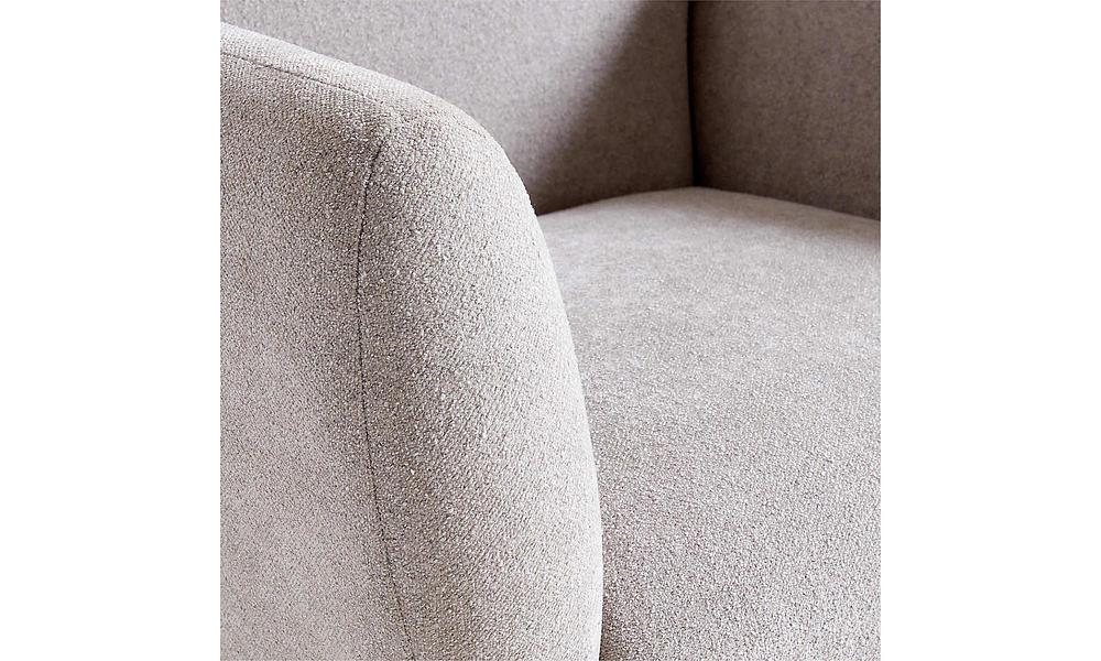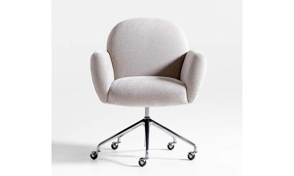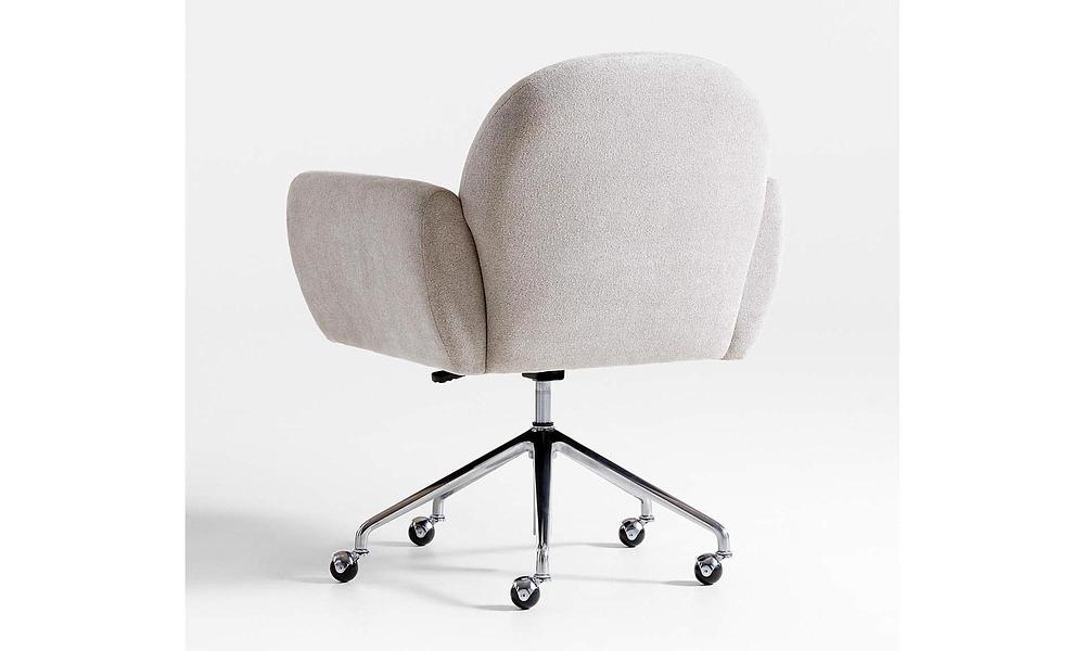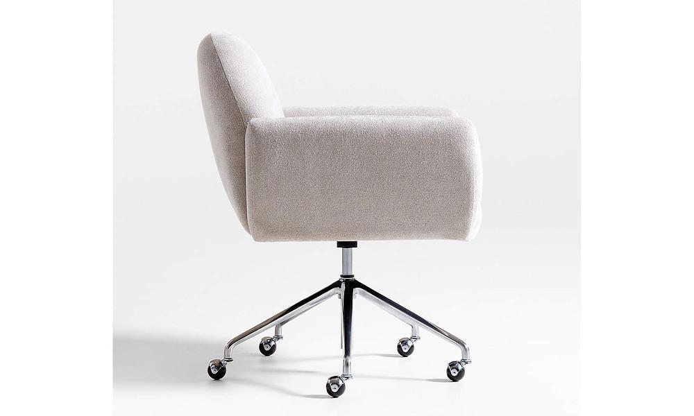 Settle into the living room-style embrace of our Imogen office chair designed for workday comfort. Upholstered in a velvety-soft fabric in decor-friendly light grey, the chair sits comfy and deep with open arms and plush cushions. A chrome-plated star base streamlines the look and rolls from desk to file cabinet on caster wheels.