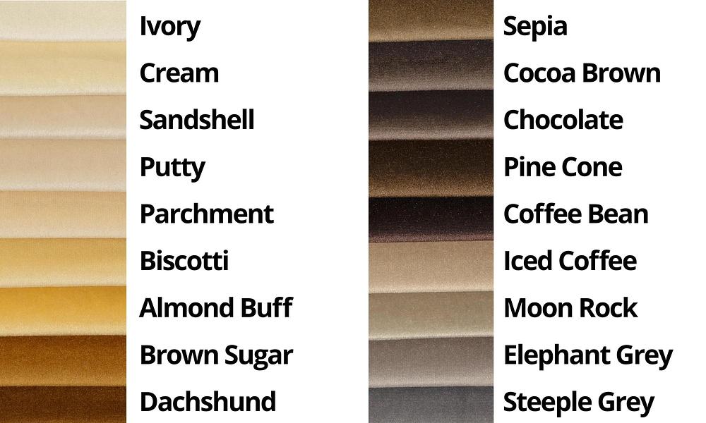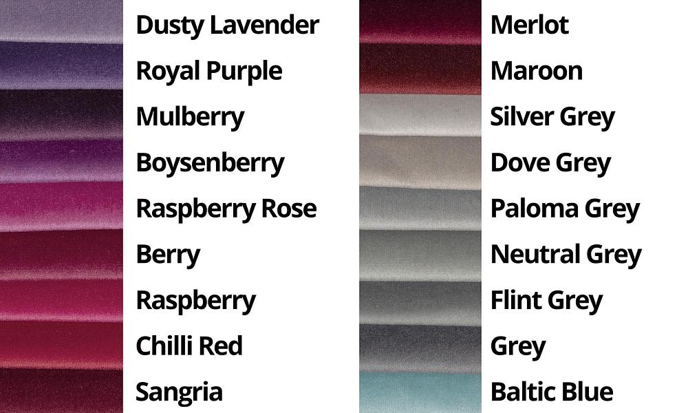 *NB we have done our best to make the colour swatch photos as accurate and true to life as possible. However, velvet can be difficult to photograph so, come and see the samples and swatch cards in our showroom. We’re happy to give you a colour swatch to take home - or we can post one out to you if you email us.