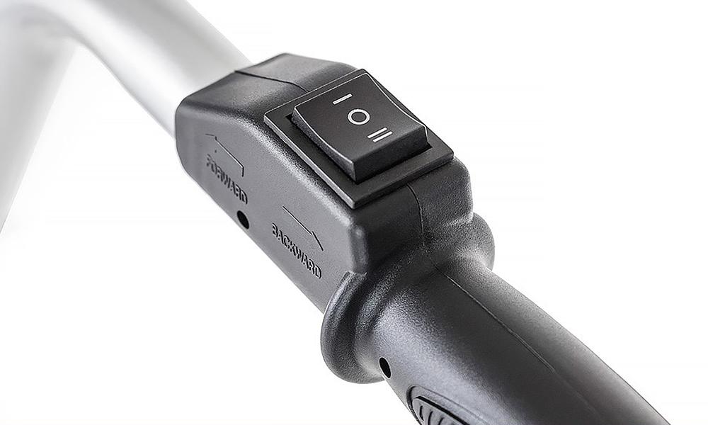 It goes in forward and reverse and has an automatic brake function. Compact telescopic handle with button control for easy maneuvering.