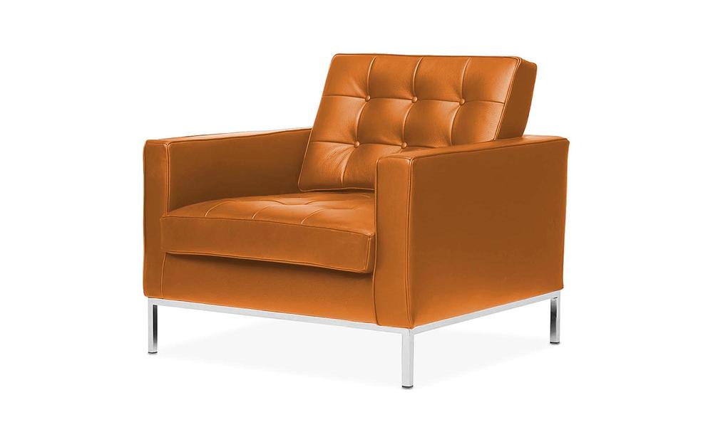 First conceived in 1954 the Florence Knoll sofa and armchair collection is an icon of modern design that embodied not only the aesthetic ethos of the time but the optimism of a post-WW2 world too. Rationally proportioned with a geometric profile the handsome architectural cubist lines of the design are softened by tufted button detailing, genuine leather, and a gently reclining backrest. The armchair is ideal for any living room, bedroom or office.