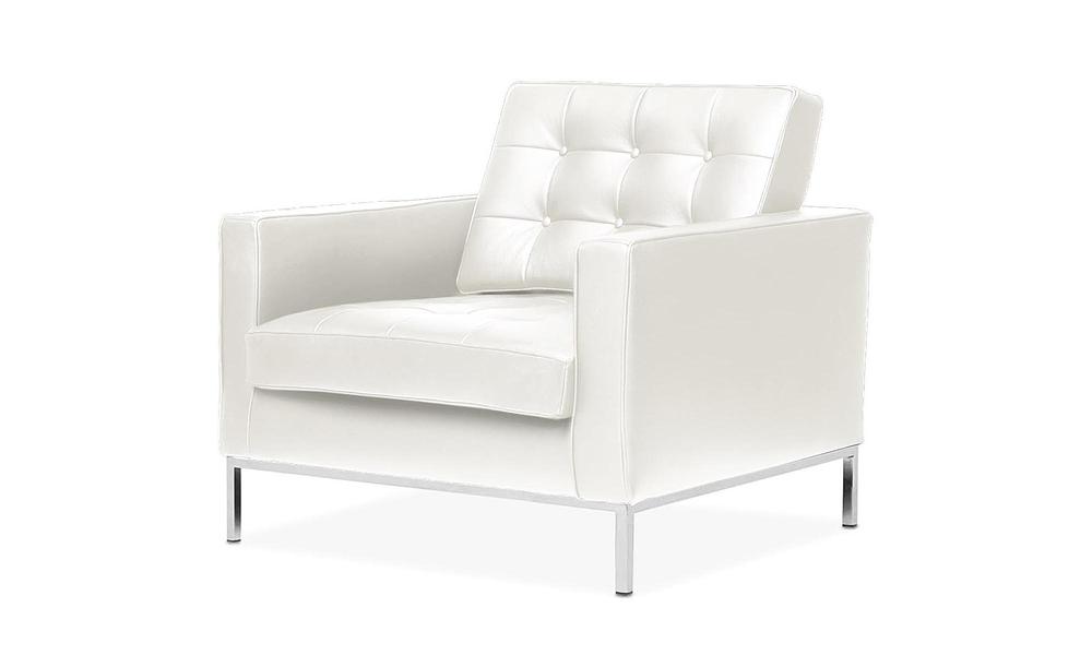 First conceived in 1954 the Florence Knoll sofa and armchair collection is an icon of modern design that embodied not only the aesthetic ethos of the time but the optimism of a post-WW2 world too. Rationally proportioned with a geometric profile the handsome architectural cubist lines of the design are softened by tufted button detailing, genuine leather, and a gently reclining backrest. The armchair is ideal for any living room, bedroom or office.
