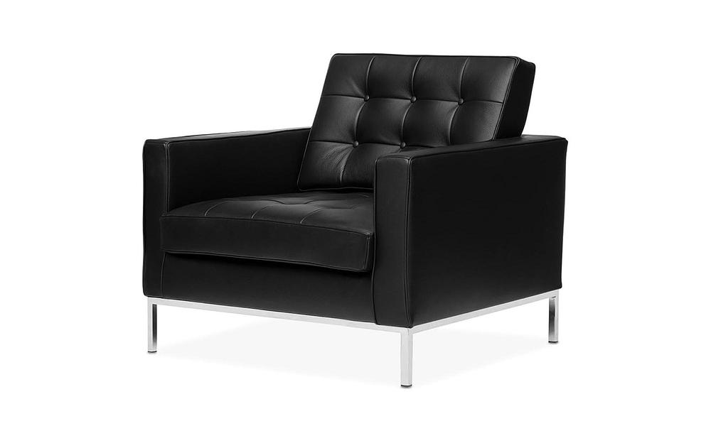 First conceived in 1954 the Florence Knoll sofa and armchair collection is an icon of modern design that embodied not only the aesthetic ethos of the time but the optimism of a post-WW2 world too. Rationally proportioned with a geometric profile the handsome architectural cubist lines of the design are softened by tufted button detailing, genuine leather, and a gently reclining backrest. The armchair is ideal for any living room, bedroom or office.