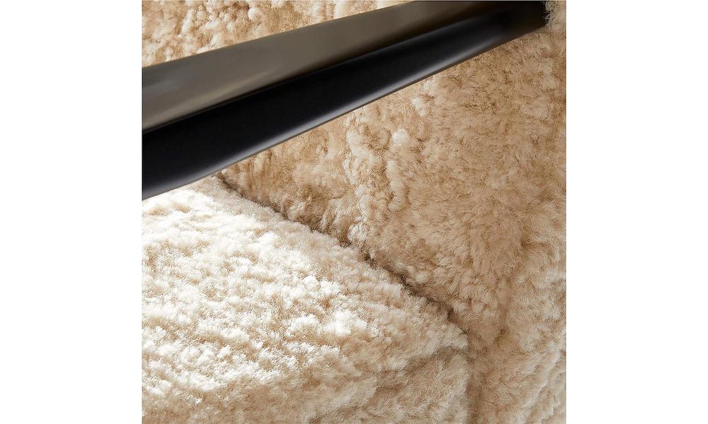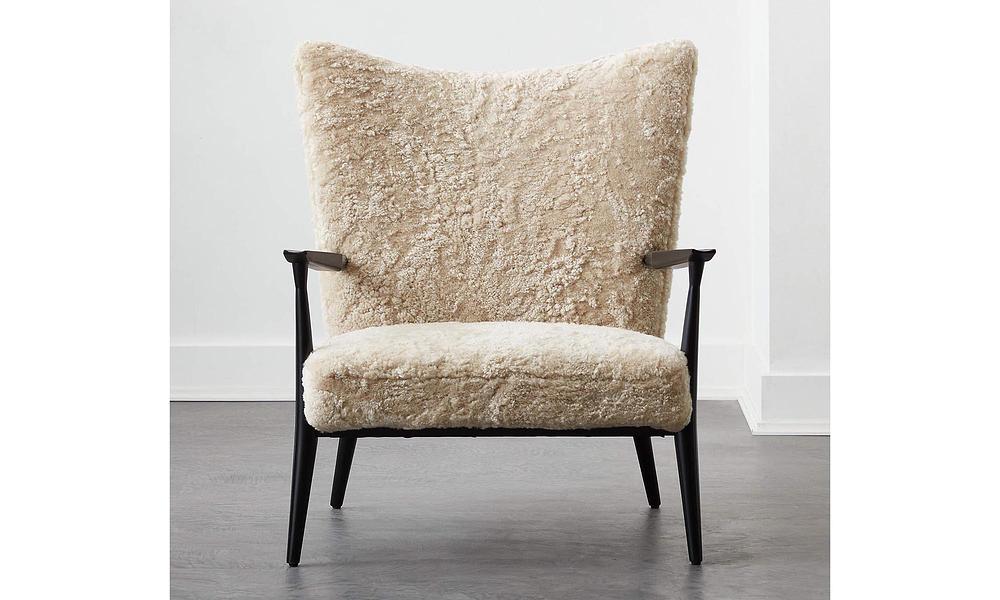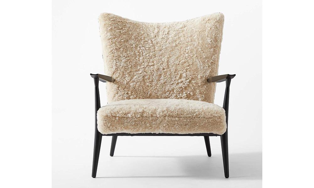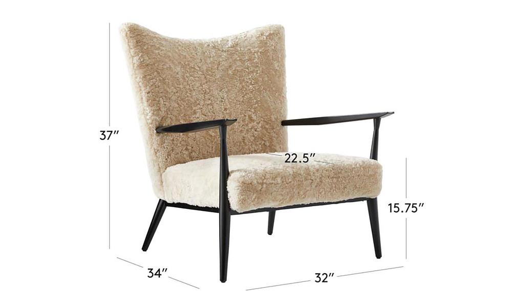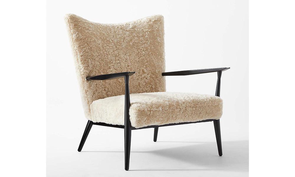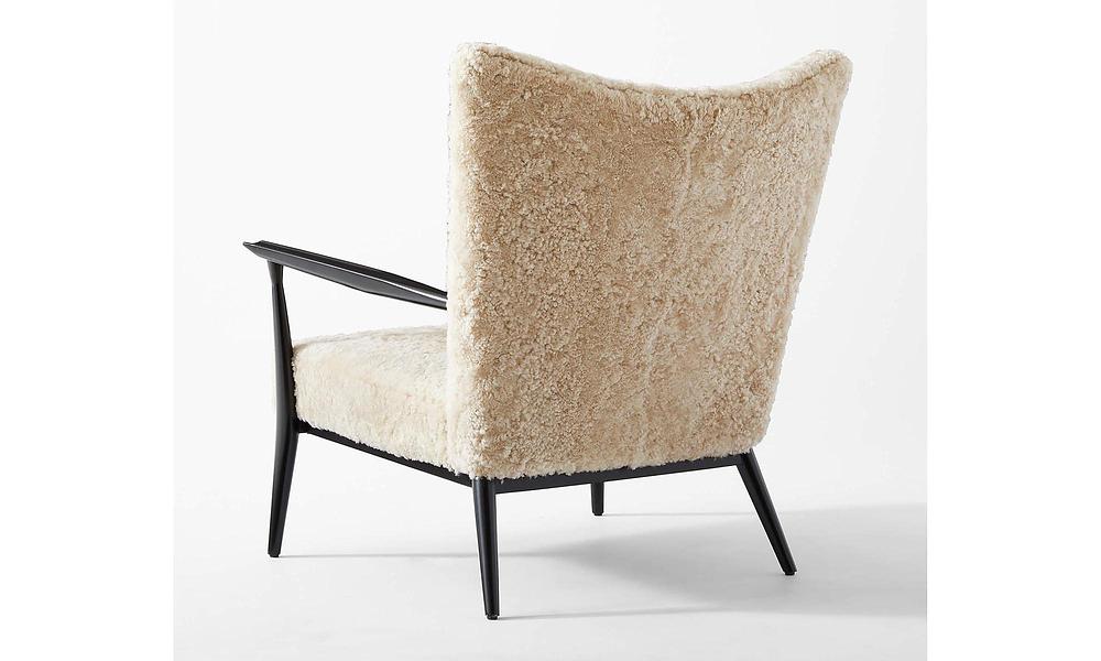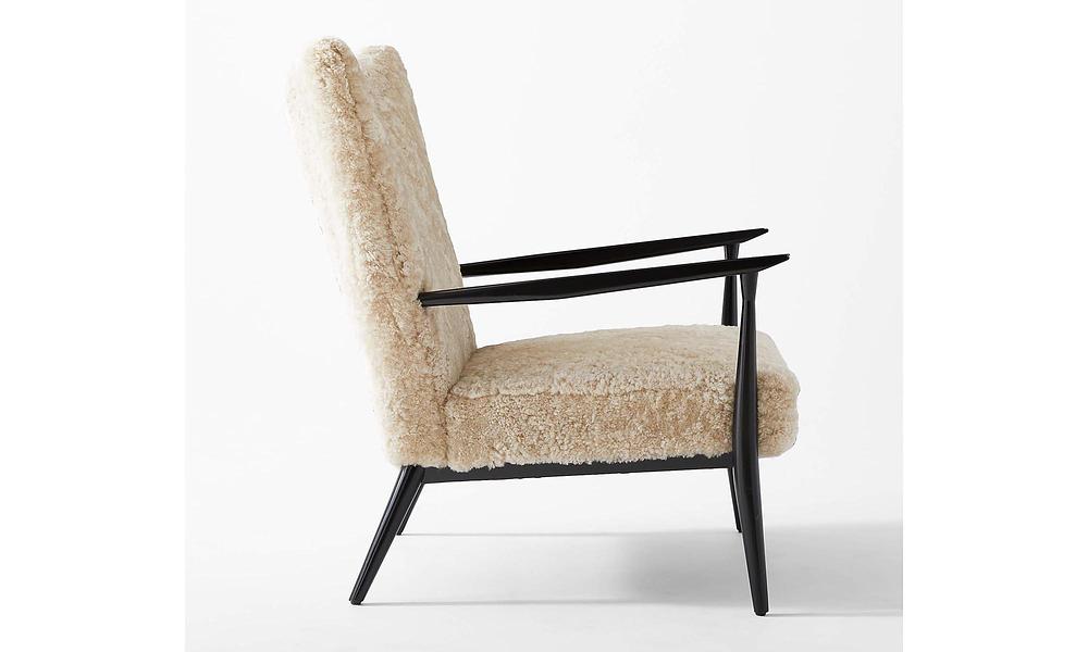 Open-arm lounge chair by Paul McCobb sports genuine shearling upholstery on a black satin FSC ®-certified beechwood frame. Has a bit of an oversized feel to it despite not having that large of a footprint—perfect for a bedroom or living room corner.