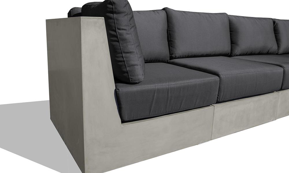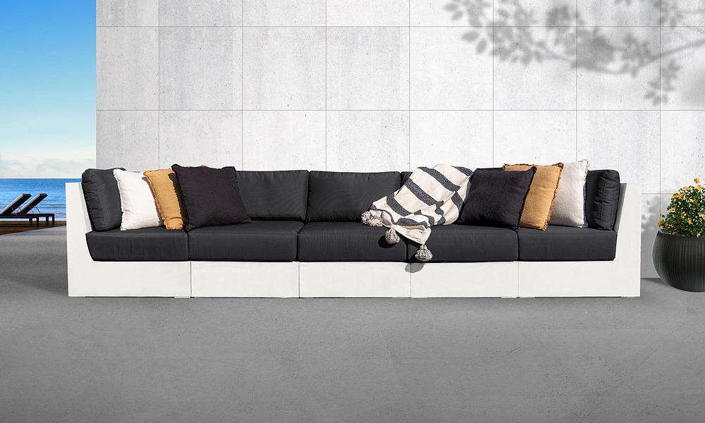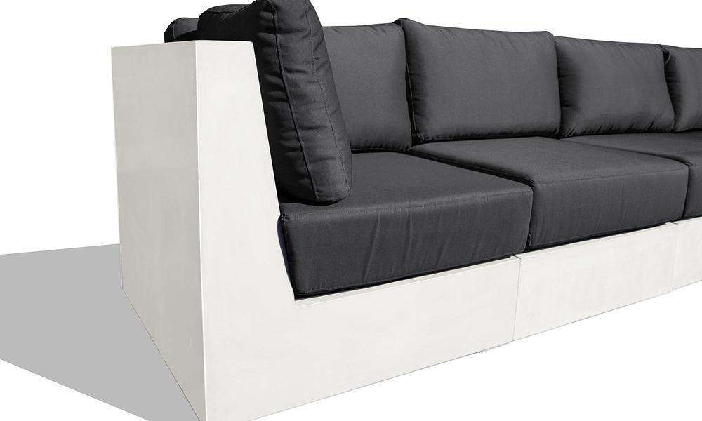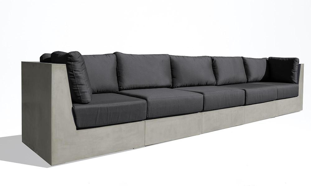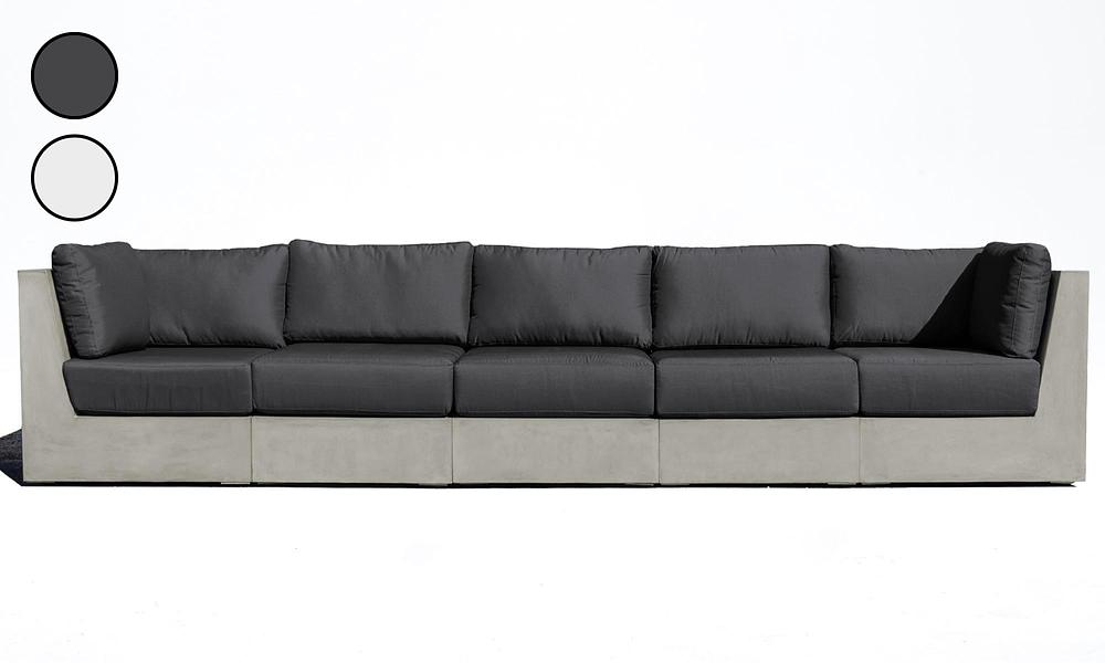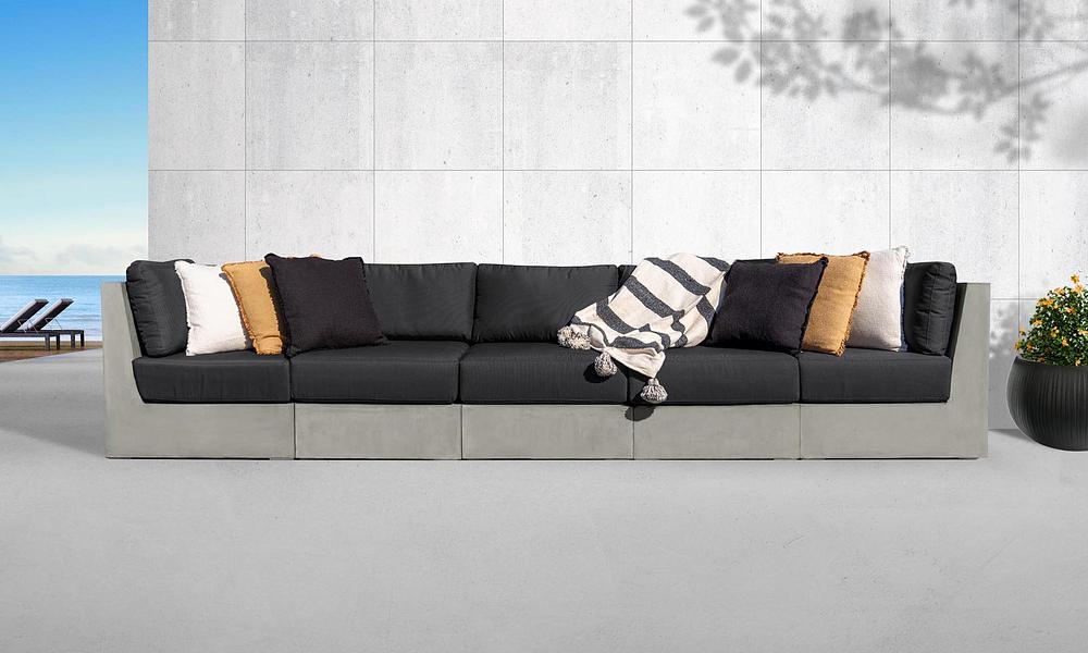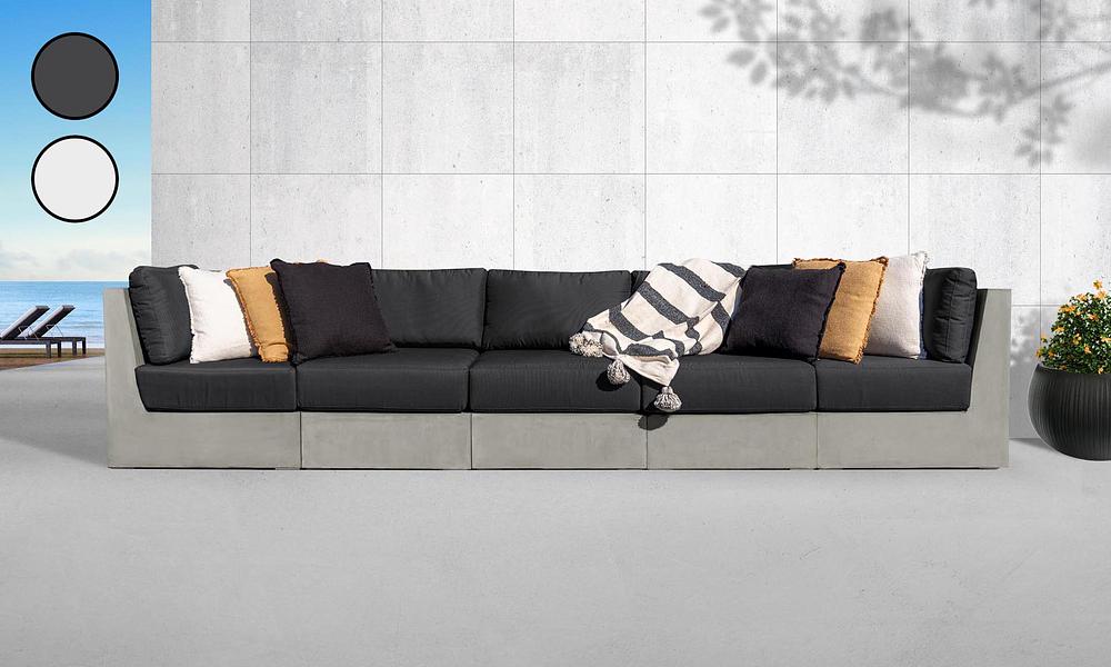 With stylish good looks this could be straight from a chic international resort. The concrete sofa as a design chameleon suiting any situation from jungle surrounds to an urban patio to a sunny pool-side location. A dramatic indoor piece too, it's made up of 2 corner (end) seats, and 3 middle seats, and the cushions are included.