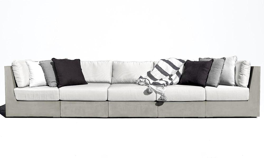 With stylish good looks this could be straight from a chic international resort. The concrete sofa as a design chameleon suiting any situation from jungle surrounds to an urban patio to a sunny pool-side location.  A dramatic indoor piece too, it's made up of 2 corner (end) seats, and 3 middle seats, and the cushions are included.