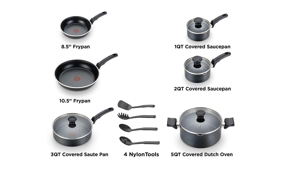 This comprehensive set includes a 10.5” frypan, 8.5” frypan, 2.8l covered sauté, 4.7l covered Dutch oven, 1.9l covered saucepan, 1l covered saucepan and 4 handy nylon tools.