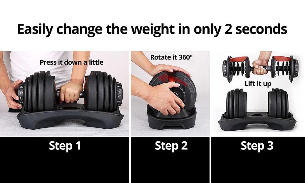 Eliminate the need for a full rack of weights and keep your place clutter free. The compact and space saving design of these adjustable dumbbells lets you store them virtually anywhere so you can bring them out when you need them for a great work out in front of the TV, in the garden or out on the balcony.