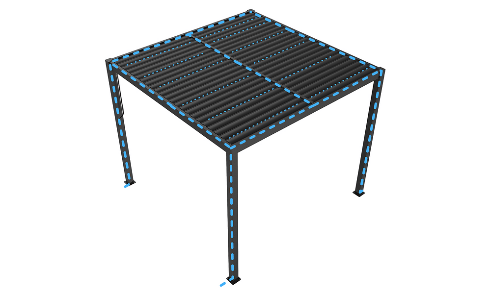 During rain showers, the Pergolas are waterproof. When the louvres are shut, rain water runs down the sides into internal gutters, then down through the legs rather than pouring out over the sides. However, please note that during heavy or torrential rain, water may drip through the louvred roof.