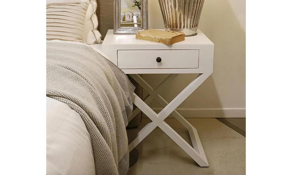 The clean lines and single drawer design offer just the right balance of form and function, while the distinctive crossed legs add architectural interest that elevates it beyond your average bedside table. Perfect for creating that serene beach house vibe, even if the nearest beach is just your shower!