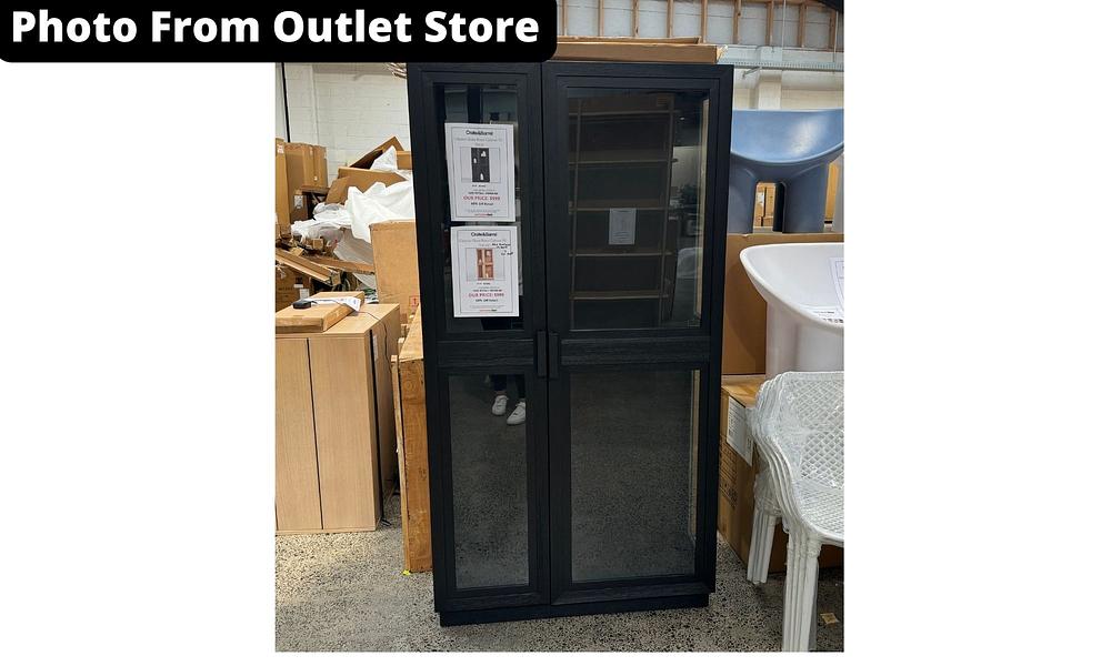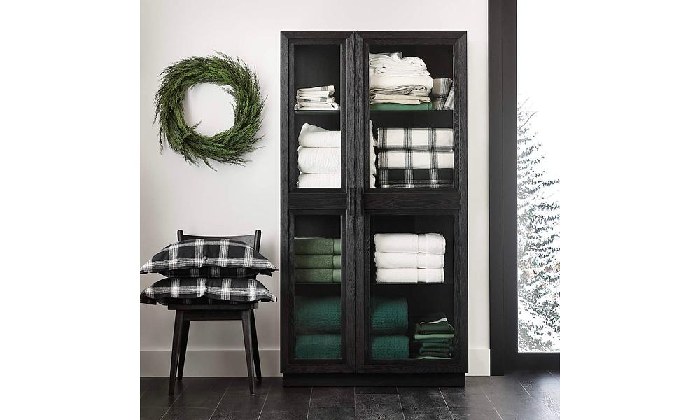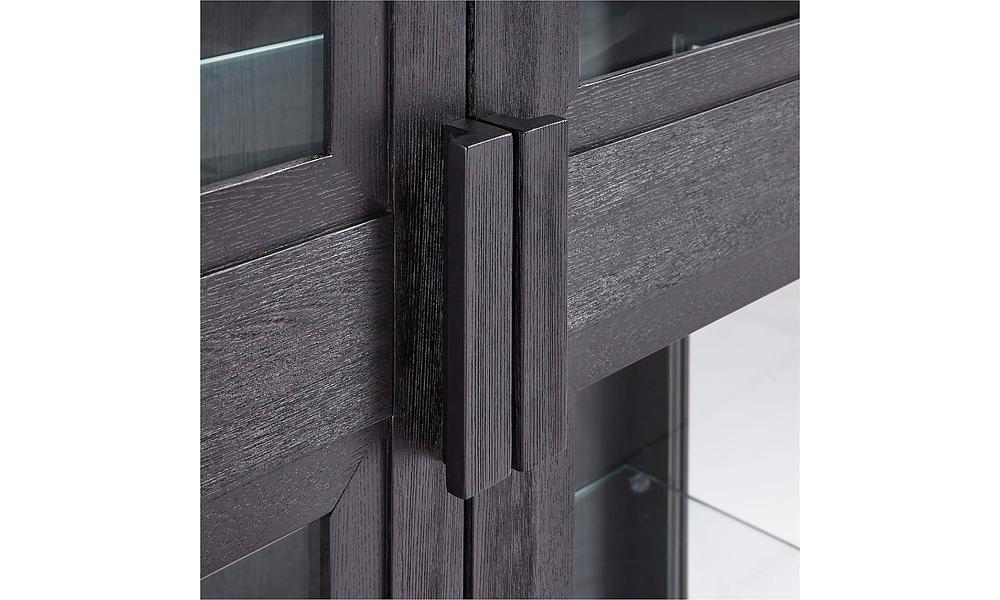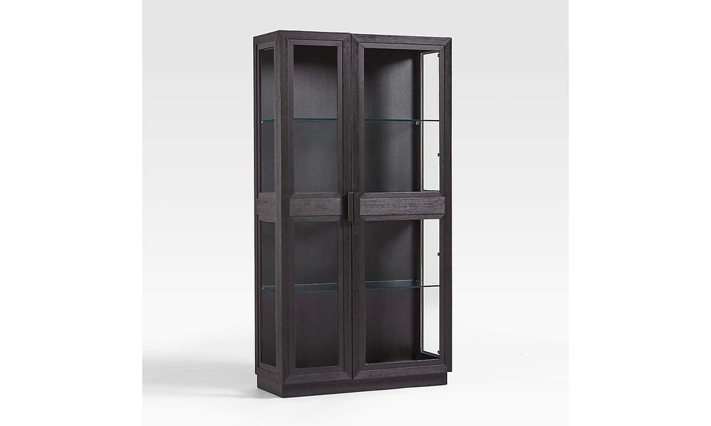 A curio cabinet for contemporary homes, Calypso opens up storage with a light and airy look. Glass door and shelves shed light on books, art glass, sculptures, vases and other collectibles. Elm wood frames with stepped trim, heavily brushed and given an ebonized black finish to bring out the grain. A recessed plinth base and blocky pulls add modern details to this timeless black cabinet, a Crate & Barrel exclusive.