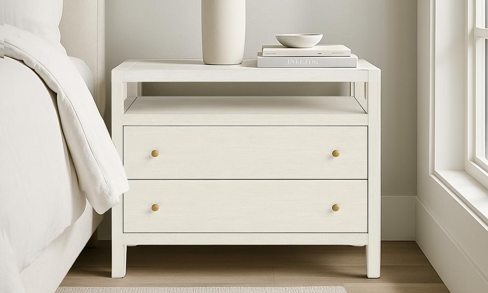 With deep drawers, an open shelf for your current read (or your phone you “never” check at 2am), and a top surface begging for a beautiful lamp, this piece isn’t just functional, it’s furniture with main-character energy.