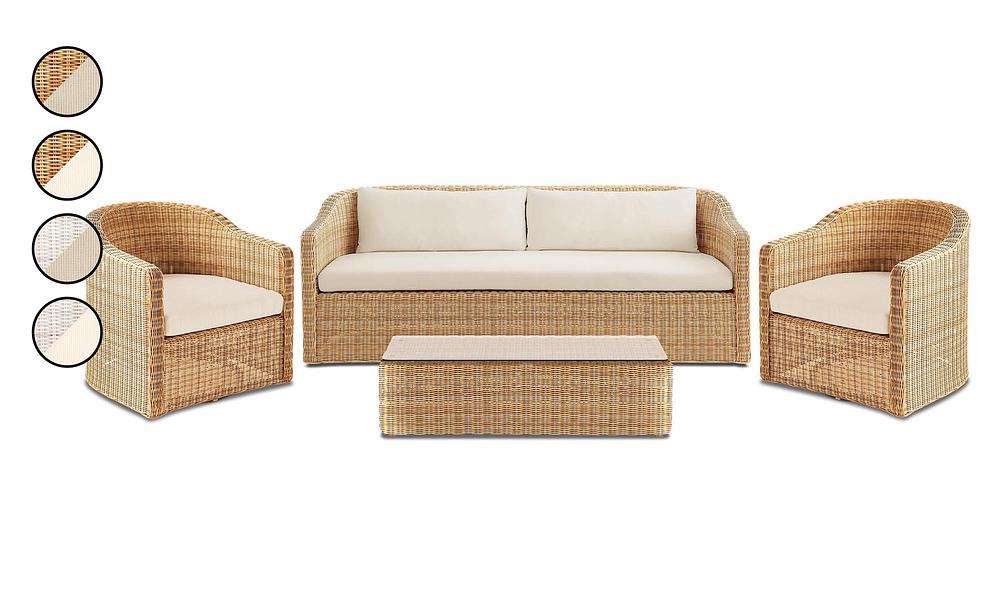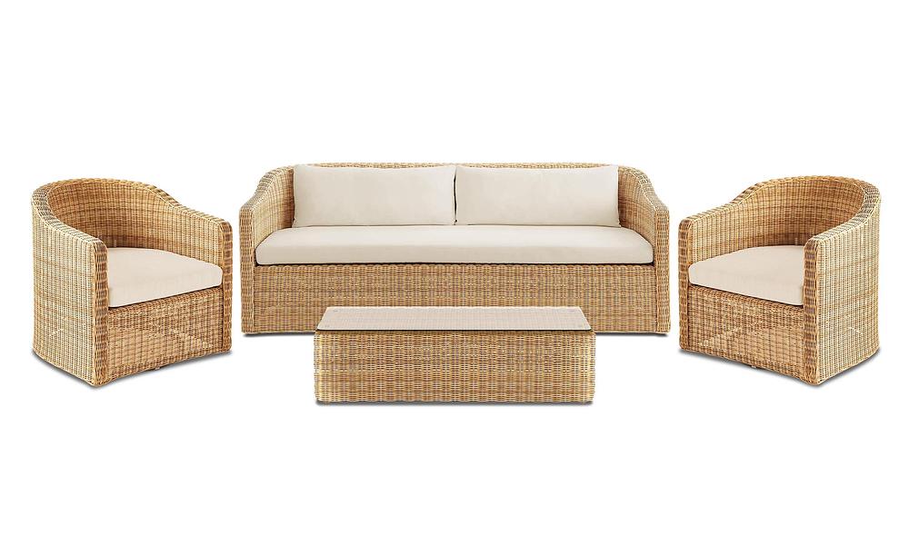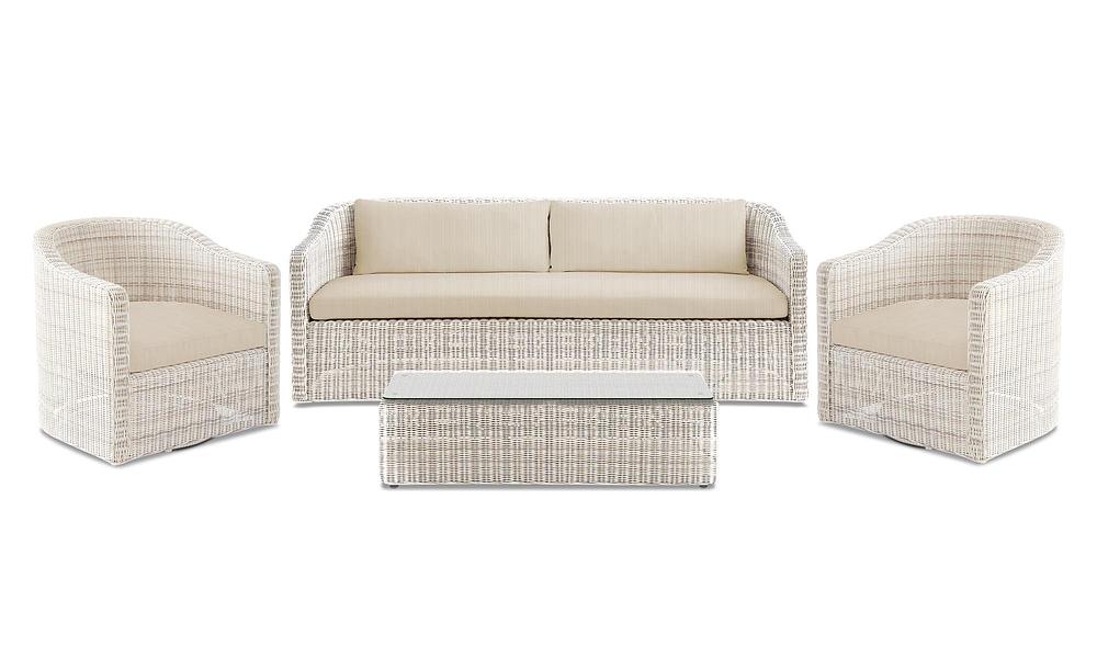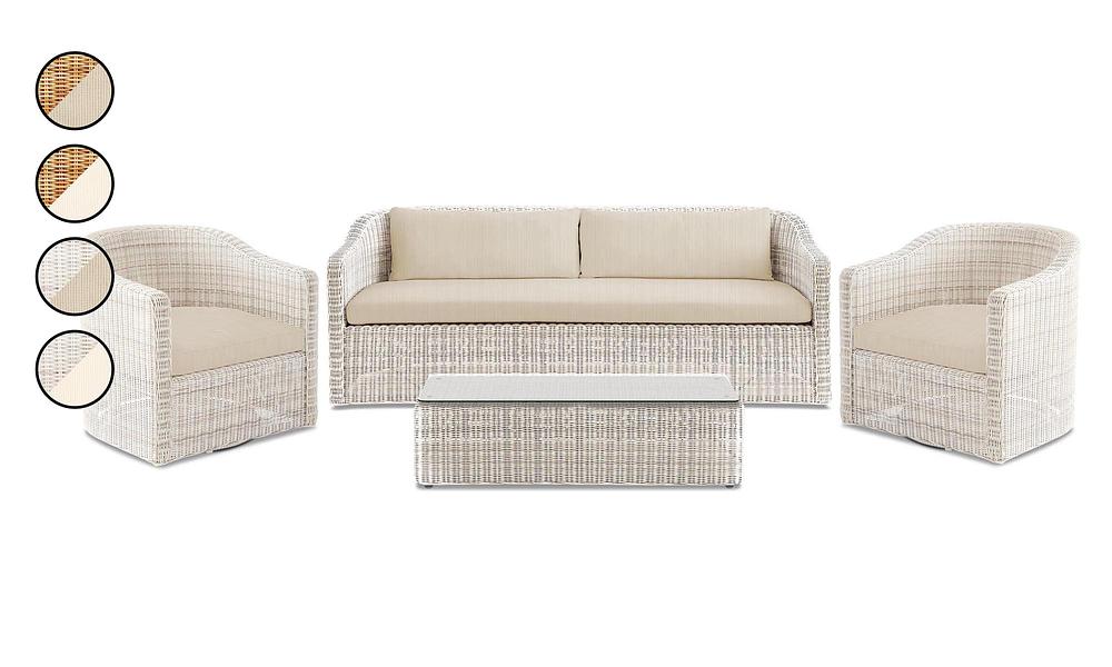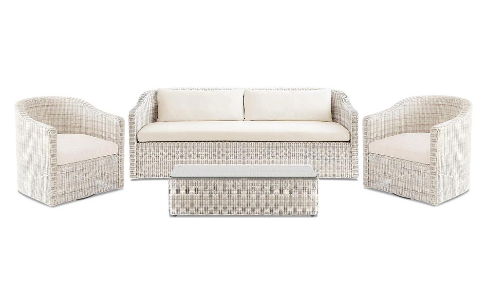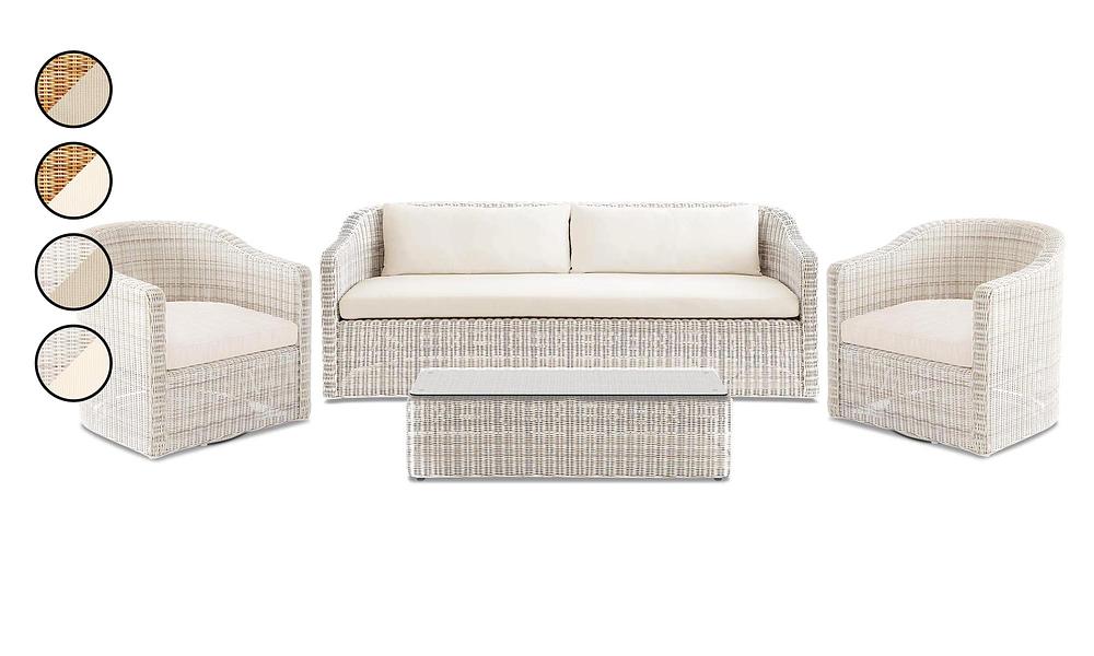 The Hampshire Wicker Set is the top of the top when it comes to wicker furniture - This beauty is as luxurious as it is durable, and is sure to elevate your outdoor living space in an instant. This elegant set includes two swivel chairs, a spacious sofa, and a sleek coffee table, all crafted with style and practicality in mind.