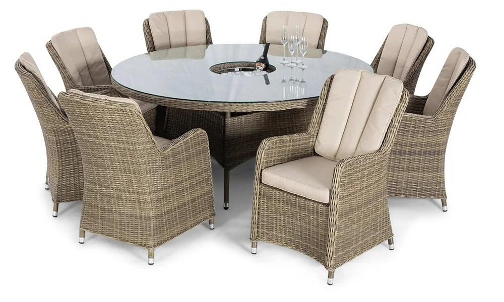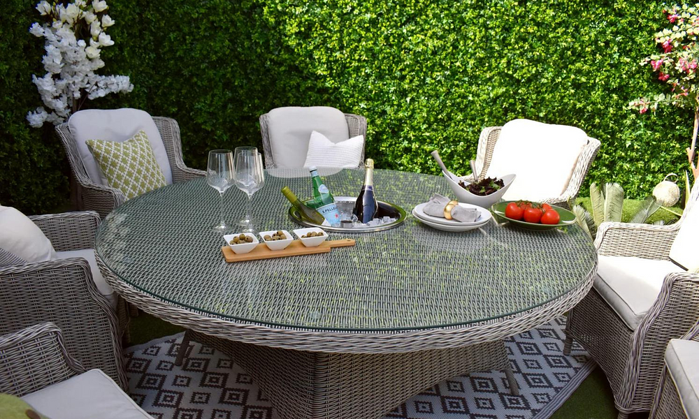 The Harper Dining Set is all about enjoying outdoor meals in style and comfort. With its elegant round table featuring a built-in ice bucket and cushioned chairs, this set is perfect for everything from casual family dinners to entertaining friends. Keep your drinks chilled and close at hand while you relax and dine. Made from durable, UV-resistant wicker, the Harper Dining Set is designed to handle the elements while keeping your outdoor space looking chic and inviting.