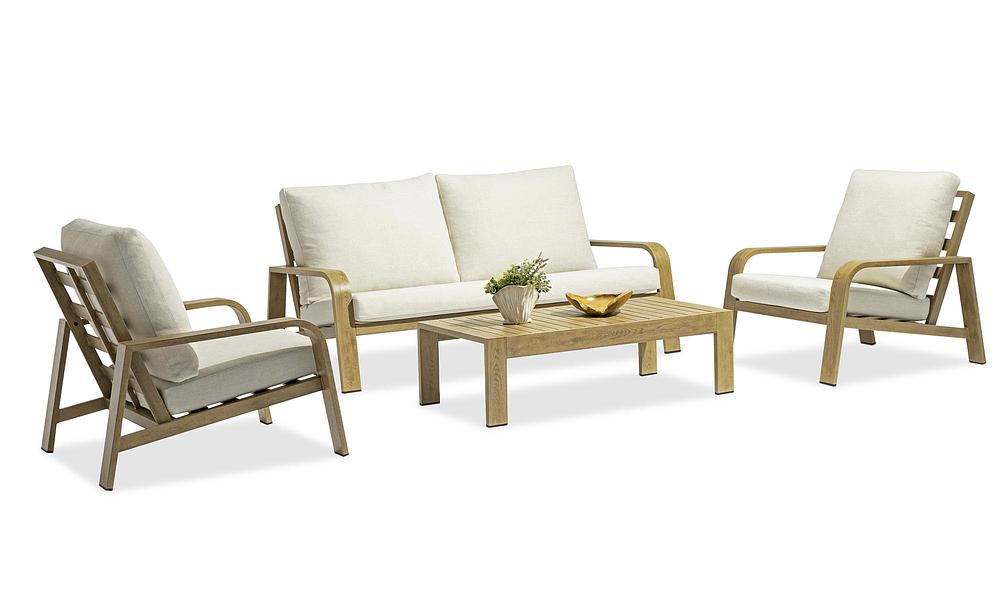 The Hudson 4-Seater outdoor sofa set combines modern design with natural charm, featuring a durable aluminium frame finished to replicate the warmth of wood. Its cushions are upholstered in weather-resistant Olefin fabric, offering a soft, comfortable seating experience. Designed for both style and durability, the set is protected with high-performance Tiger brand powder coating, ensuring it withstands the elements while maintaining its elegant appearance.