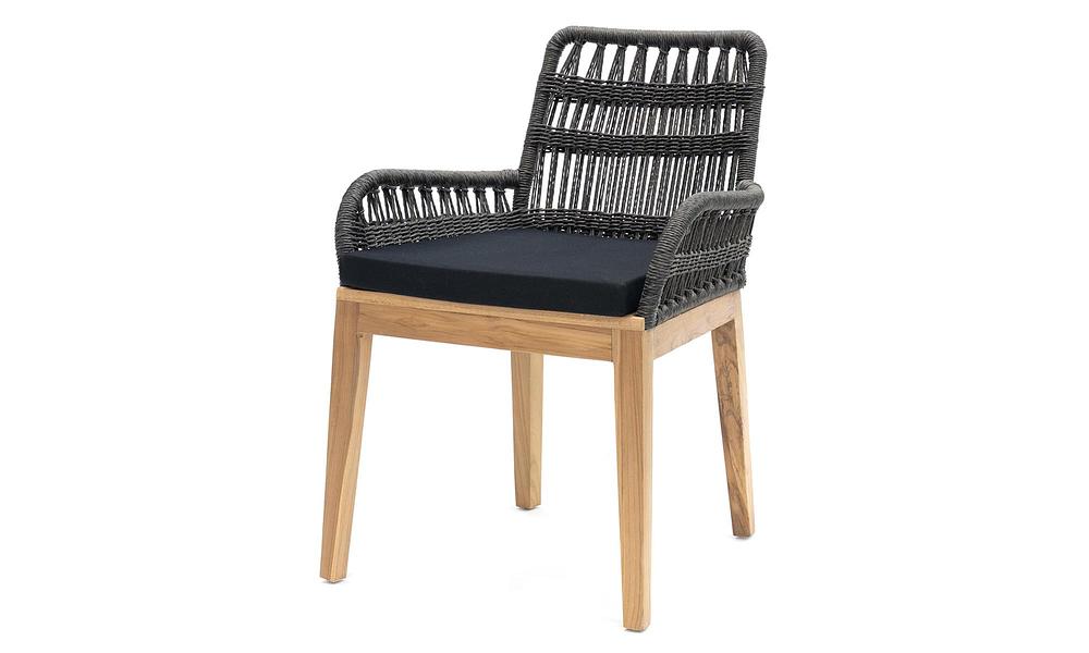 Available in a Natural finish with an ivory seat cushion for a soft, sun-warmed look, or in Charcoal with a black cushion for a bold contrast.