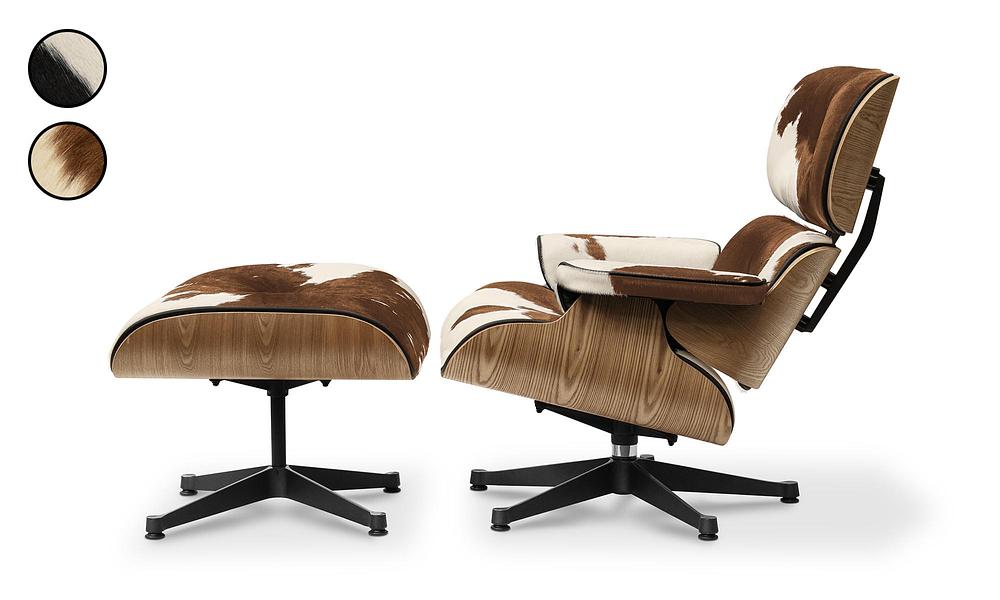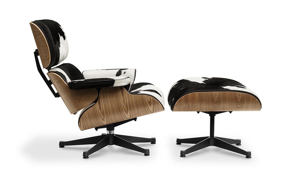 - Genuine black & white cowhide leather with plywood base with ash veneer, high-density sponge filling, and black aluminium legs.