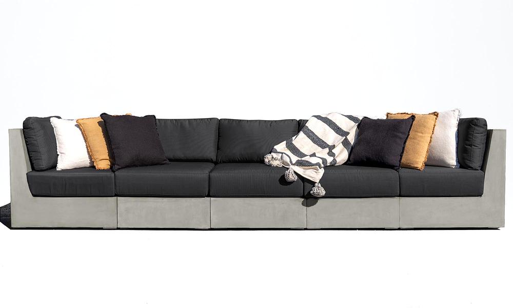 With stylish good looks this could be straight from a chic international resort. The concrete sofa as a design chameleon suiting any situation from jungle surrounds to an urban patio to a sunny pool-side location. A dramatic indoor piece too, it's made up of 2 corner (end) seats, and 3 middle seats, and the cushions are included.