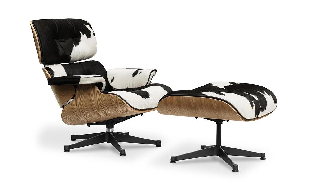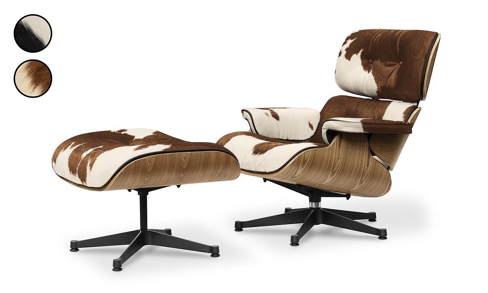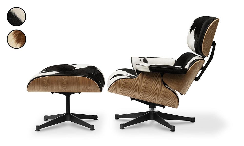 - Genuine black & white cowhide leather with plywood base with ash veneer, high-density sponge filling, and black aluminium legs.