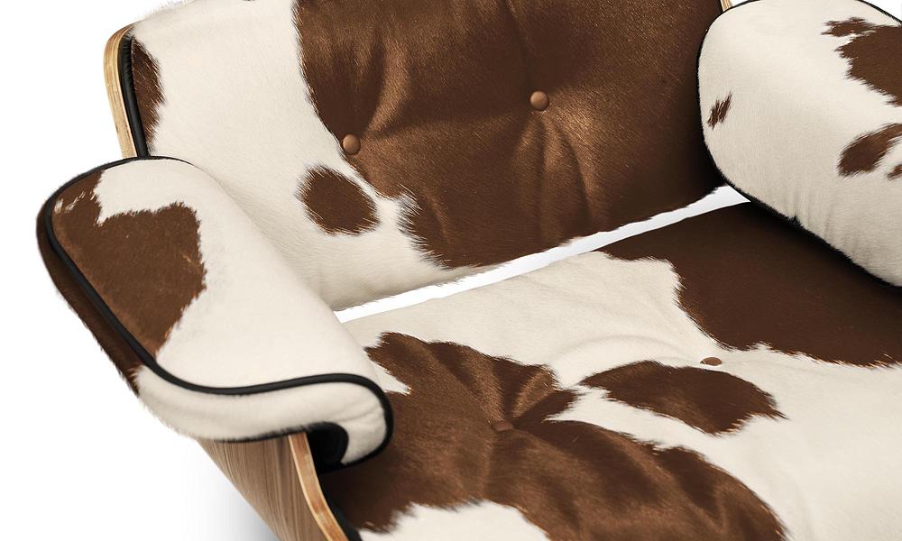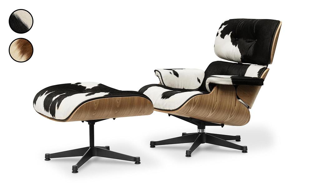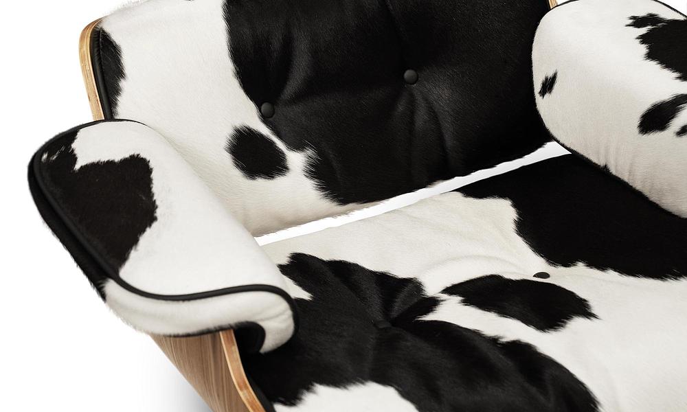 - Genuine black & white cowhide leather with plywood base with ash veneer, high-density sponge filling, and black aluminium legs.