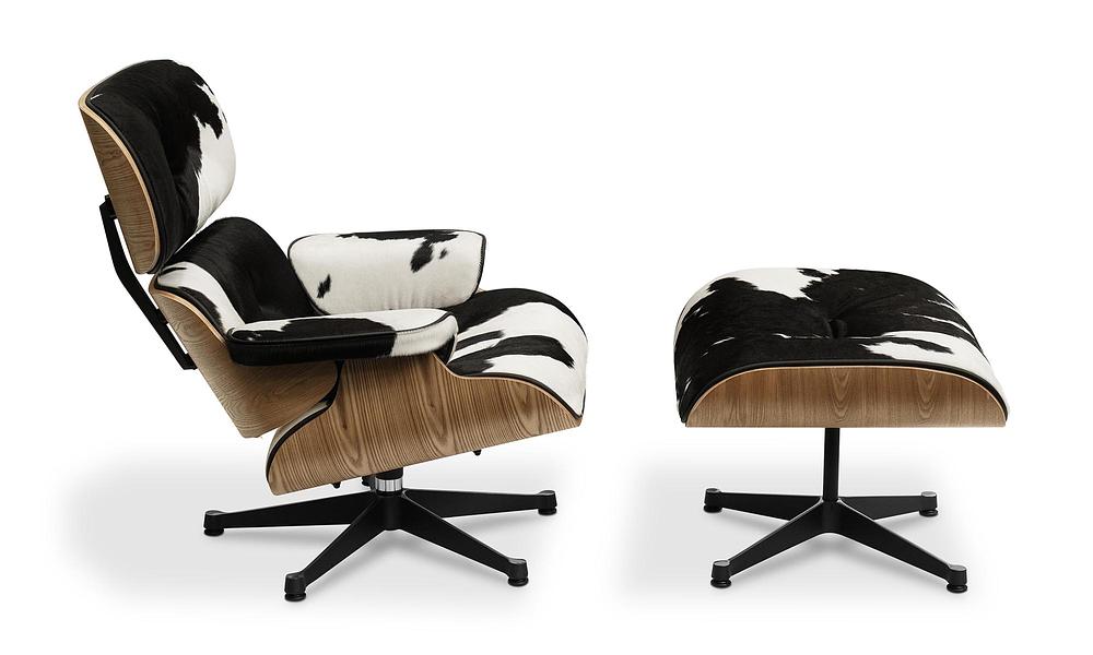 - Genuine black & white cowhide leather with plywood base with ash veneer, high-density sponge filling, and black aluminium legs.
