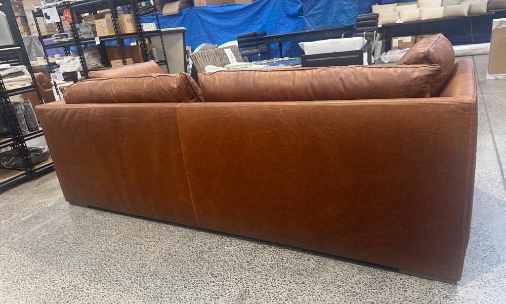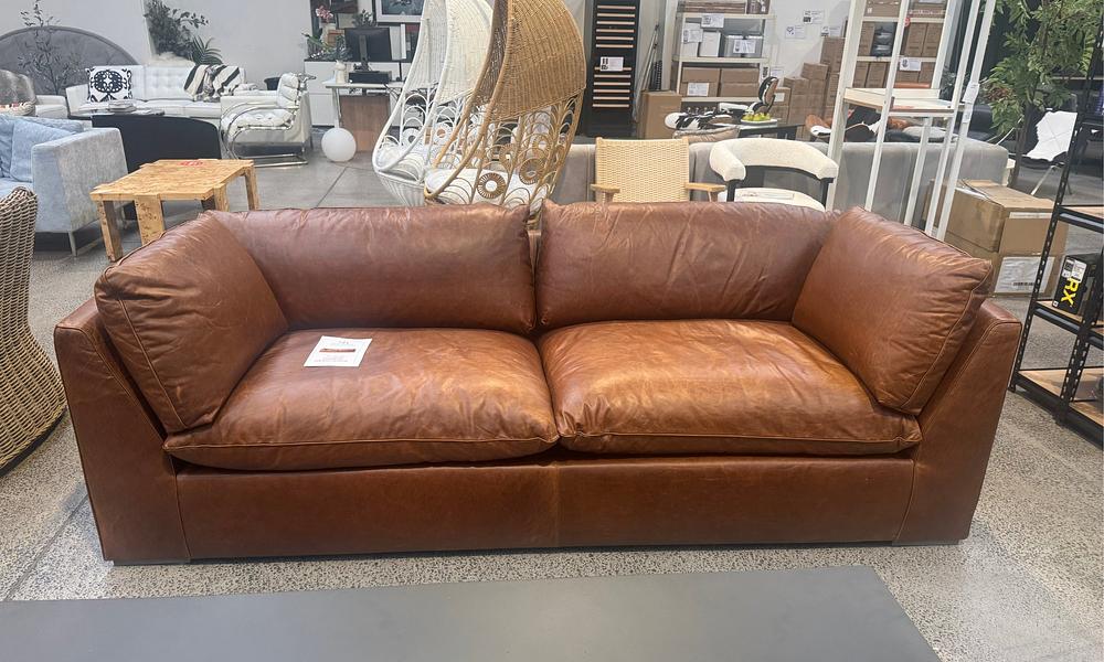 Step into pure luxury with this Restoration Hardware Leather Sofa, now available in our showroom, but only for one lucky buyer. Crafted in that rich, buttery-smooth premium chestnut leather that ages like fine whisky, this piece is the definition of timeless design meets everyday indulgence.