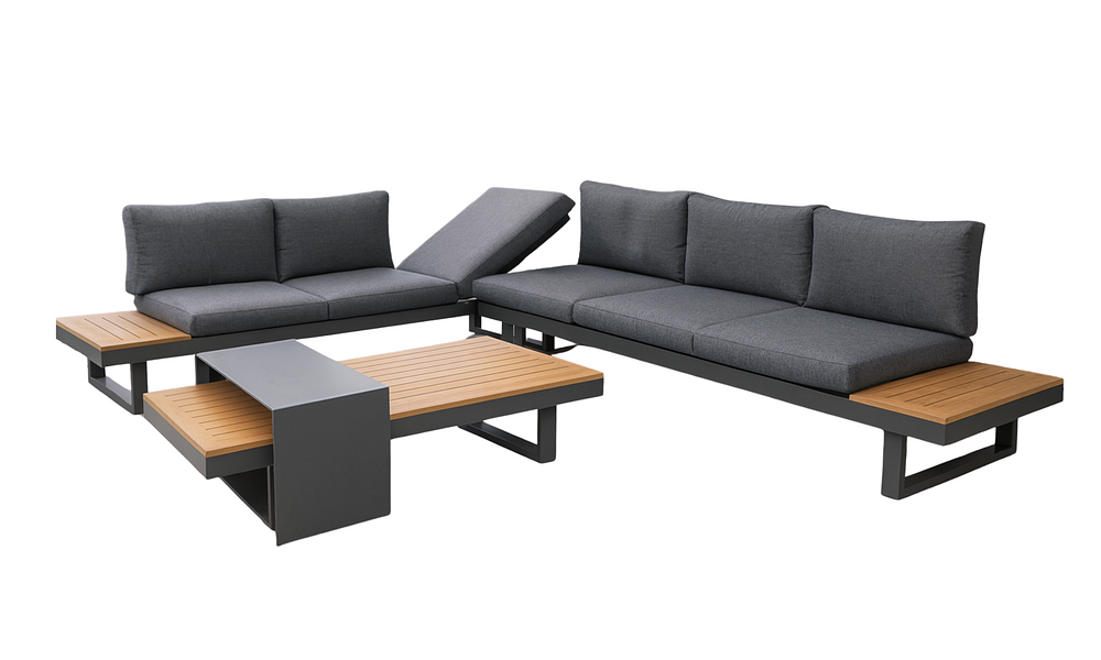 Inspired by our bestselling San Sebastian set, the San Remo brings signature comfort and modular versatility to your outdoor space.With integrated wood-look side tables, a reclinable lounger section, and deep, plush cushions, it’s made for relaxed, resort-style living at home.