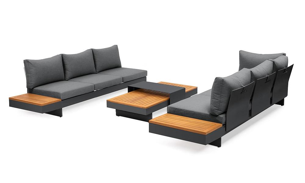 Make a huge style statement in your outdoor entertainment precinct, with our over-sized L-shaped sectional sofa set. With its chic industrial metal aesthetic, stylish foam cushions and matching bench-shaped coffee table, it’s big enough for a group to relax, chat and snack in absolute style.