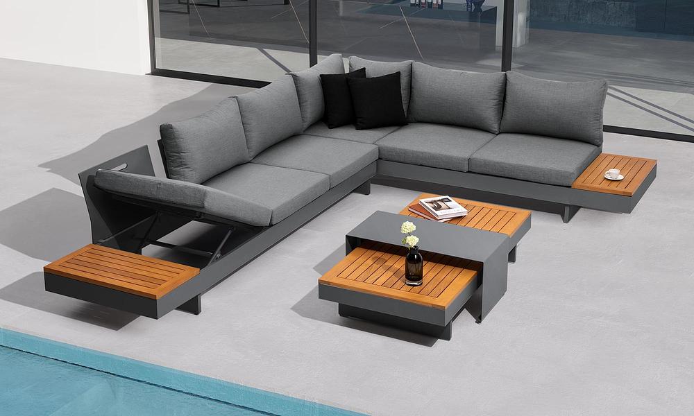 Make a huge style statement in your outdoor entertainment precinct, with our over-sized L-shaped sectional sofa set. With its chic industrial metal aesthetic, stylish foam cushions and matching bench-shaped coffee table, it’s big enough for a group to relax, chat and snack in absolute style.