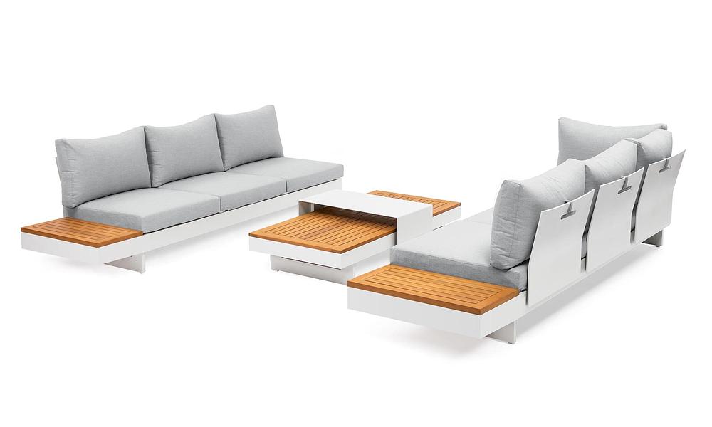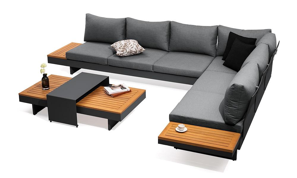 Make a huge style statement in your outdoor entertainment precinct, with our over-sized L-shaped sectional sofa set. With its chic industrial metal aesthetic, stylish foam cushions and matching bench-shaped coffee table, it’s big enough for a group to relax, chat and snack in absolute style.