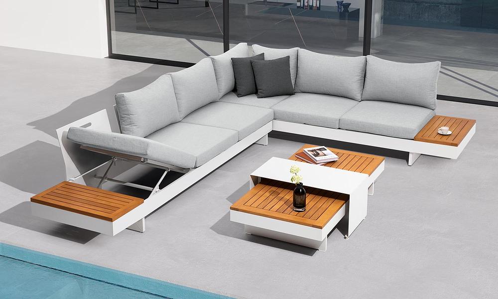 L-shaped sectional with acacia top with aluminium  coffee table